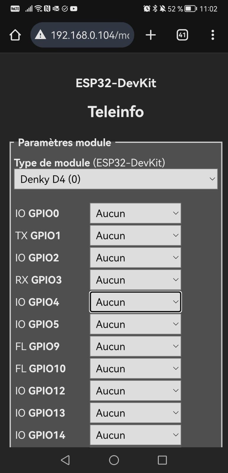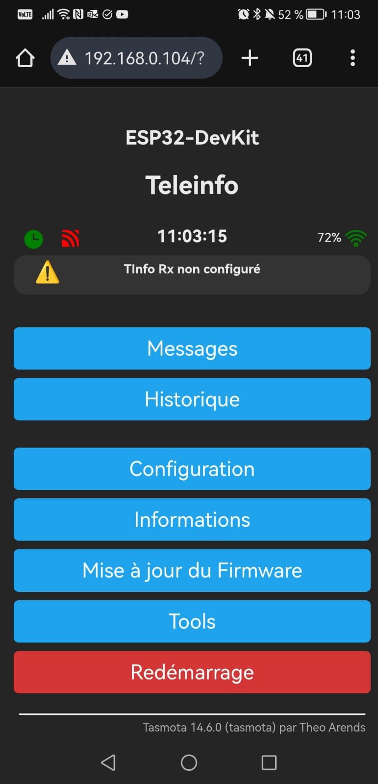 J'ai réussi à uploader ton module téléinfo tasmota et m'y connecter. Par contre, il m'affiche l'erreur "TInfo Rx non configuré". En regardant dans les paramètres du module, je n'y vois aucun paramétrage. Peut-être est-ce là qu'il me manque quelque chose ?